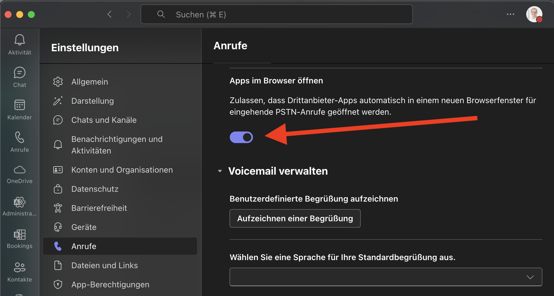 - Aktiviere die Option "Apps im Browser für eingehende PSTN-Anrufe öffnen":