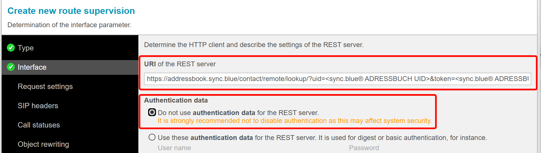 Die UID findest du am gleichen Ort wie den Token für das Adressbuch.Wähle nachfolgend Do not use authentication data for the REST server aus.