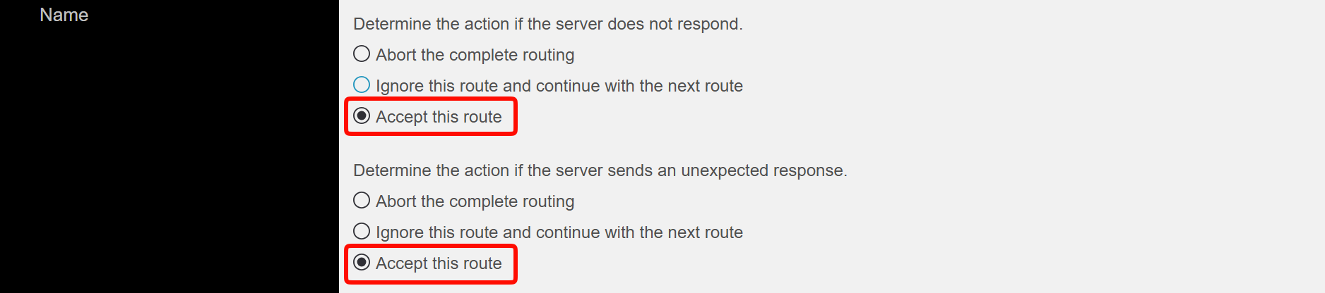 Request Settings: Stelle das Verhalten bei unerwarteten oder fehlenden Rückantworten des Servers auf Accept this route.