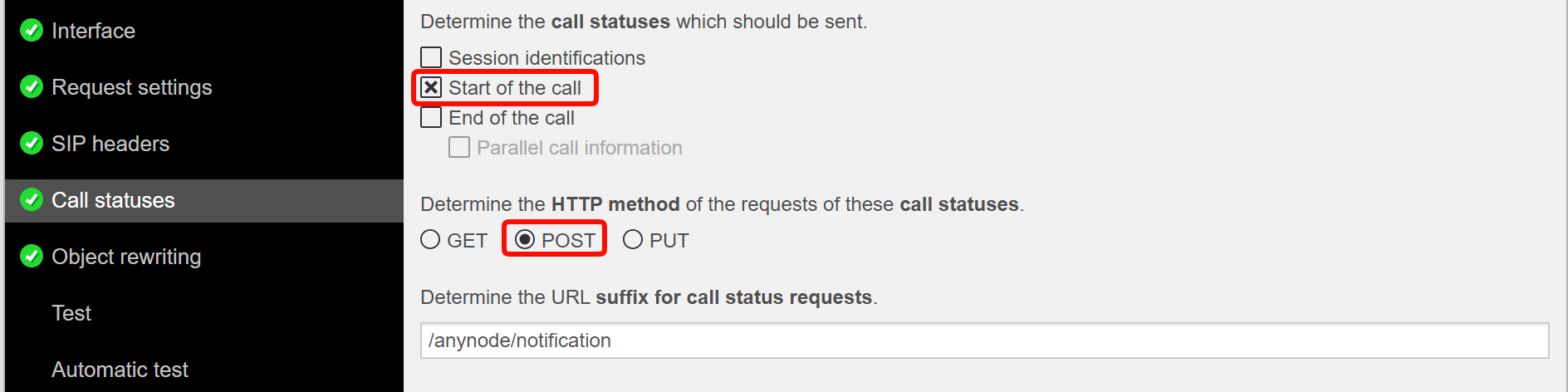 Call statuses: Aktiviere die Checkbox Start on Call und lasse die HTTP method auf POST stehen.
