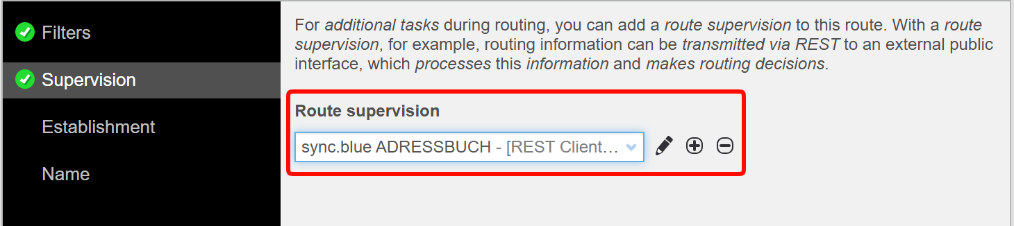 Mithilfe des Tokens und dem sync.blue® ADRESSBUCH haben wir bereits alles, was wir für das Einrichten in anynode benötigen. Für die Einrichtung gehen wir die einzelnen Schritte des "Route Supervision"-Assistenten durch: