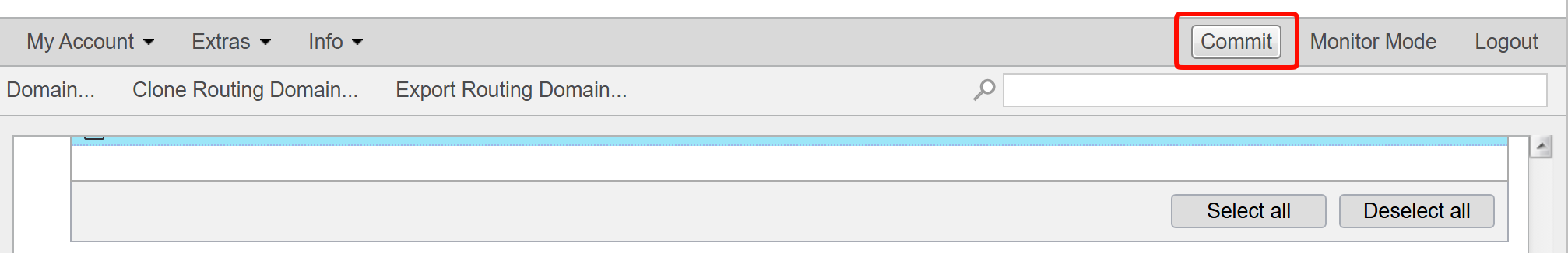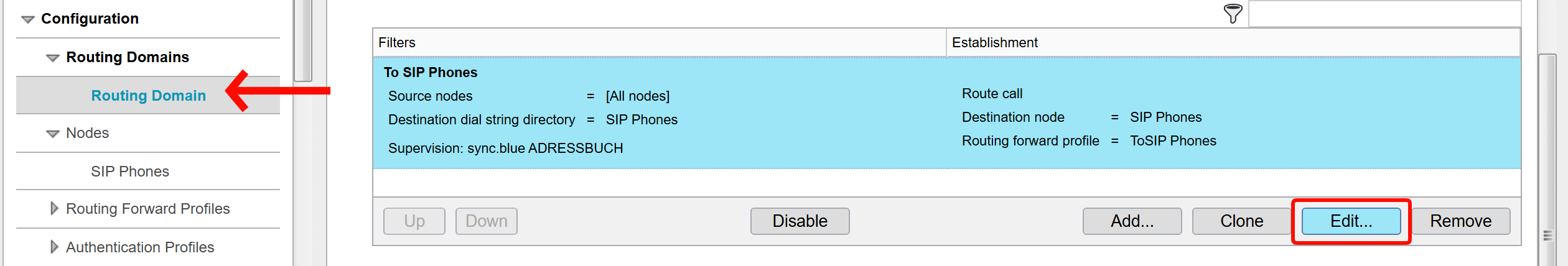 Navigiere in der linken Hauptnavigation zu Configuration -> Routing Domains: Navigiere in der linken Hauptnavigation zu diesem Punkt und wähle die gewünschte Domain aus. Klicke im Hauptfenster im Reiter Routes auf die passende Verbindung und drücke Edit.