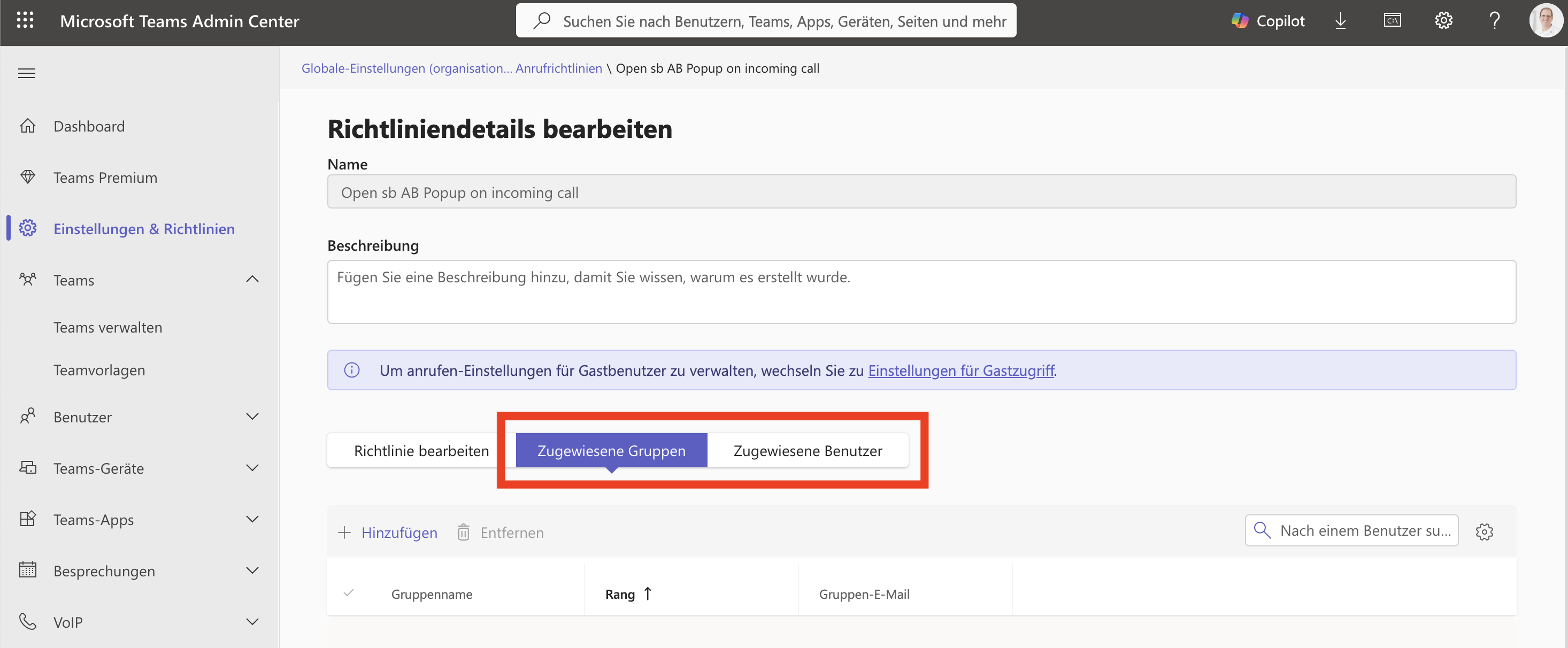 - In the Microsoft 365 Teams Admin Center, create a new call policy (VoIP - Call policies) or edit an existing policy that suits your company's needs: