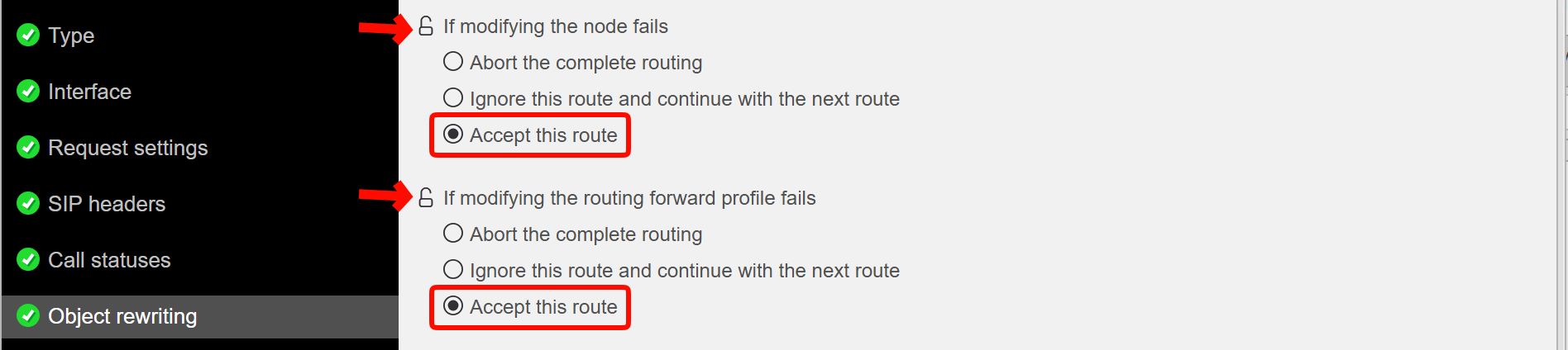 Object rewriting: Click the locks on the menu items and use the setting Accept this route.