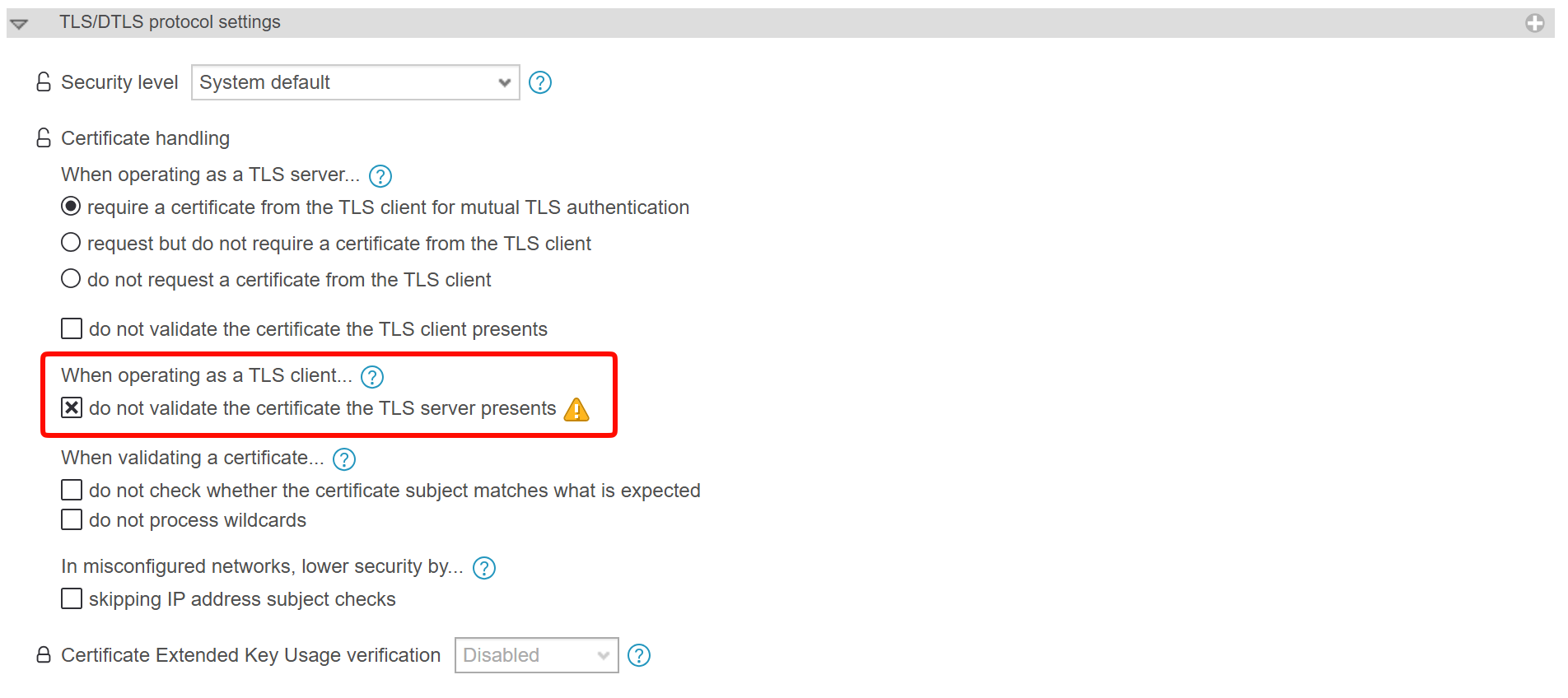 - TLS/DTLS protocol settings: anynode may have problems verifying our certificate. Enable the checkbox do not validate the certificate the TLS Server presents here. The connection between the telephone system and the sync.blue® ADDRESS BOOK remains encrypted.